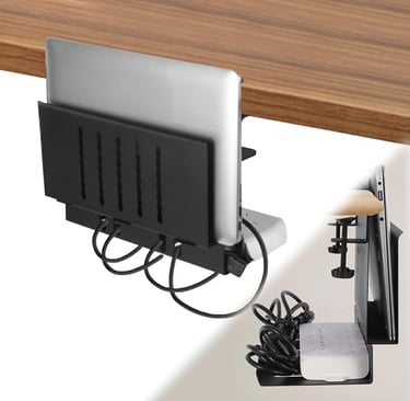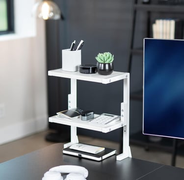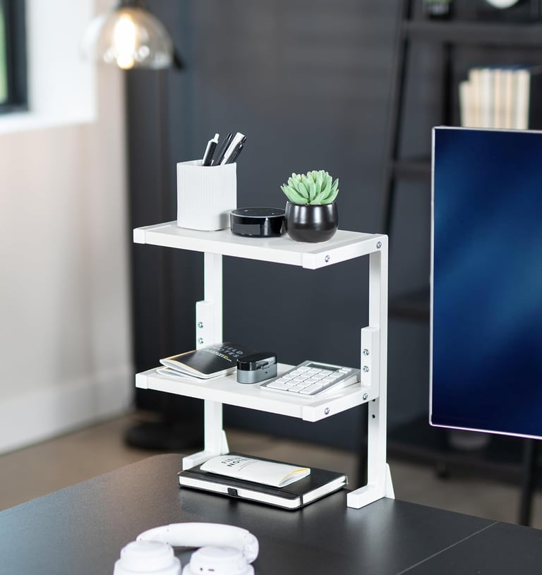 Stack devices or books on this clamp-on shelving unit. Can be mounted under the desk to free up desk top.