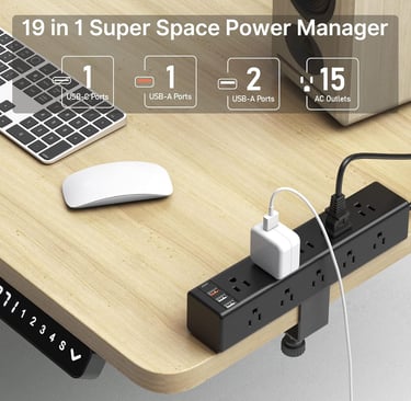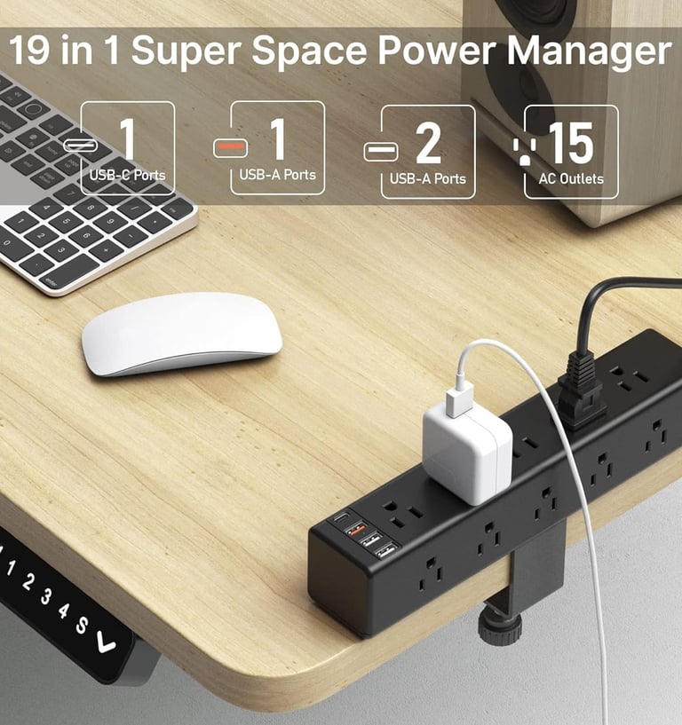 This power strip has 15 outlets and usb and usb-c ports. Mount it under your desk to free up valuable space.