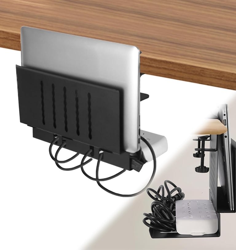 Save space on your desk with a mounted laptop holder with built-in cable management tray.